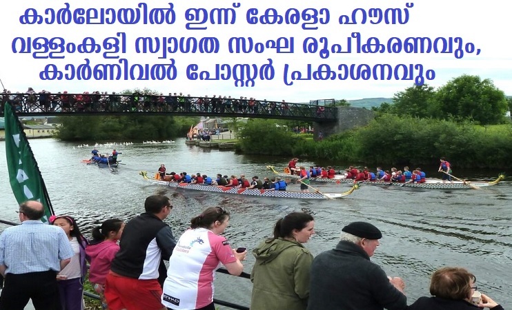 കാര്‍ലോ : കൗണ്ടി കാര്‍ലോയിലെ ബാരോ നദിയുടെ ഓളപ്പരപ്പുകളില്‍ മലയാളി കരുത്തിന്റെ പുളകം നിറച്ച് അയര്‍ലണ്ടിലെ കേരളാ ഹൌസ് ഒരുക്കുന്ന വള്ളംകളിയുടെ സ്വാഗത സംഘ രൂപീകരണം ഇന്ന് കാര്‍ലോയില്‍ നടത്തപ്പെടും. കാര്‍ലോയിലും പരിസരപ്രദേശങ്ങളിലുമുള്ള പൊതുസമൂഹത്തിന്റെ കൂട്ടായ്മയാണ് വള്ളംകളിയ്ക്ക് അമരക്കാരാവുന്നത്.