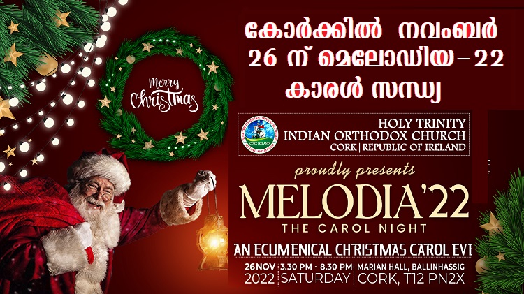 കോര്‍ക്ക്: അയര്‍ലണ്ടിലെ കോര്‍ക്ക് ഹോളി ട്രിനിറ്റി ഇന്ത്യന്‍ ഓര്‍ത്തഡോക്‌സ് ചര്‍ച്ചിന്റെ അഭിമുഖ്യത്തില്‍, ക്രിസ്മമസ് രാവുകളെ വരവേല്‍കാനായി എക്യുമെനിക്കല്‍ കരോള്‍ സന്ധ്യ, മെലോഡിയ-22 നവംബര്‍ 26-നു കോര്‍ക്ക് ബാലിന്‍ഹസ്സിഗ്ഗ് മരിയന്‍ ഹാളില്‍ (T12 PN2X) വച്ച് നടത്തപെടുന്നു. ഈ ഗാനസന്ധ്യയില്‍ അയര്‍ലന്‍ണ്ടിലെ വിവിധ ക്രൈസ്തവ ദേവാലയങ്ങളില്‍ നിന്നും പ്രൊഫഷണല്‍ ഗ്രൂപ്പുകളില്‍ നിന്നുമുള്ള ക്വയര്‍ ടീമുകള്‍ പങ്കെടുക്കുന്നതാണ്. അയര്‍ലണ്ടിലെ വിവിധ ദേവാലയങ്ങളില്‍ നിന്നും ആളുകള്‍ ഈ ഗാനസന്ധ്യയില്‍ സംബദ്ധിക്കുന്നതാണ്.