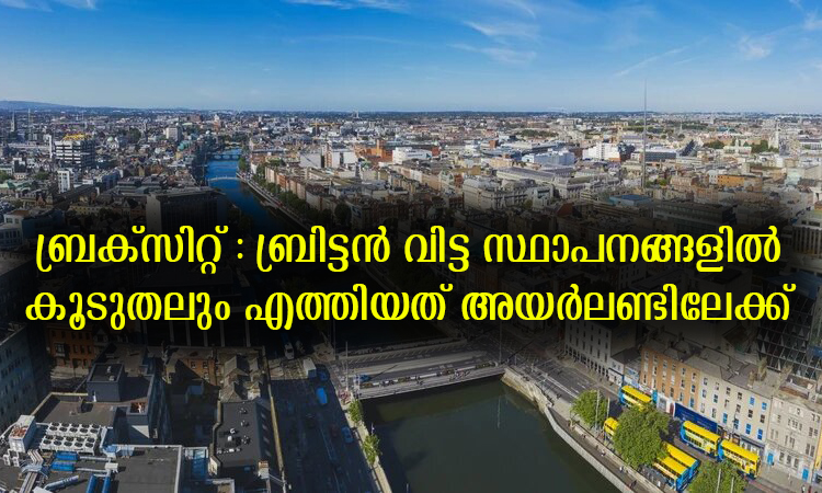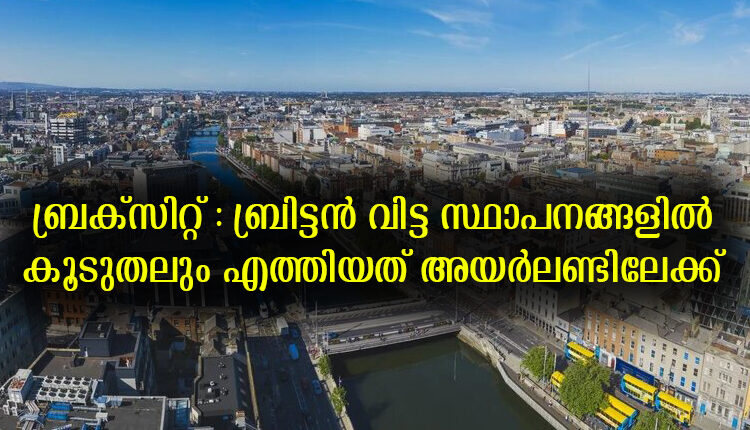 ഡബ്ലിന് : ബ്രക്സിറ്റിന് ശേഷം യുകെ വിട്ട സ്ഥാപനങ്ങളിലേറെയും ചേക്കേറിയത് അയര്ലണ്ടിലേക്ക്. യുകെ വിട്ടവര്ക്ക് ഡബ്ലിനാണ് പിന്നീട് ആകര്ഷകമായി തോന്നിയതെന്നാണ് ഇവൈ ഫിനാന്ഷ്യല് സര്വീസസ് ബ്രക്സിറ്റ് ട്രാക്കര് സര്വ്വേ വെളിപ്പെടുത്തുന്നത്.