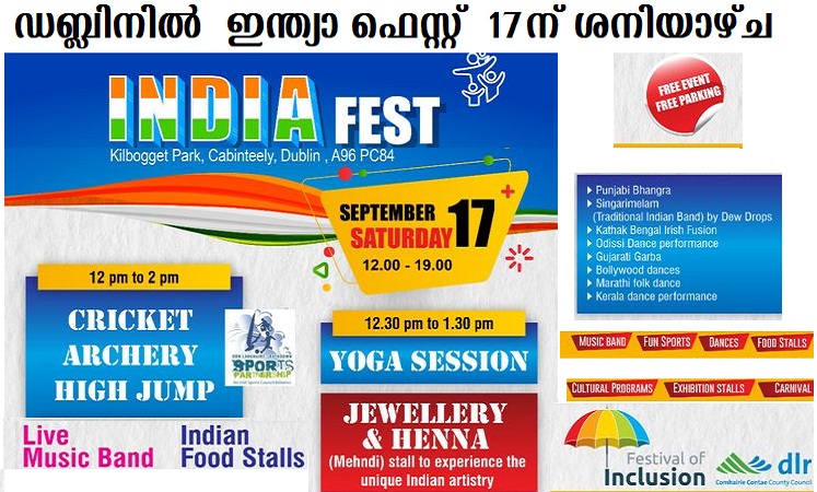 ഡബ്ലിന്‍ : ഇന്ത്യയുടെ അതിസമ്പന്നമായ പൈതൃകവും പാരമ്പര്യവും വൈവിധ്യവും സംസ്‌കാരവും ലോകത്തോട് വിളിച്ചുപറയുന്ന ഇന്ത്യാ ഫെസ്റ്റ് സെപ്തംബര്‍ 17ന് ശനിയാഴ്ച ഡബ്ലിനില്‍ നടക്കും.