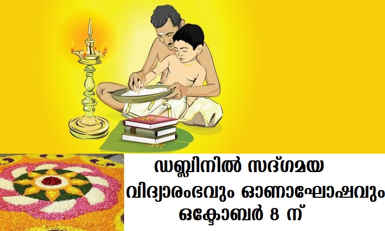 ഡബ്ലിന് : അയര്ലണ്ടിലെ ആദ്യമലയാളി ഹിന്ദുകൂട്ടായ്മയായ സദ്ഗമയ സത്സംഘിന്റെ ആഭിമുഖ്യത്തില് വിദ്യാരംഭവും ഓണാഘോഷവും ഒക്ടോബര് 8 ശനിയാഴ്ച നടത്തപ്പെടുന്നു. Dublin, Ballymonunt ലെ VHCCI temple ല് വച്ച് രാവിലെ 10 മണിക്ക് ബ്രഹ്മശ്രീ ഇടശ്ശേരി രാമന് നമ്പൂതിരിയുടെ മുഖ്യ കാര്മ്മികത്വത്തില് വിദ്യാരംഭപൂജകള് ആരംഭിക്കും.