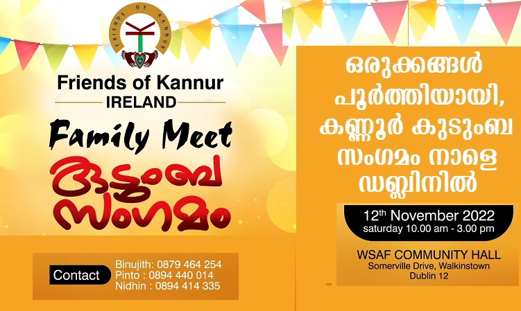 ഡബ്ലിന്: കണ്ണൂര് ജില്ലയുടെ വിവിധ മലയോര ഗ്രാമങ്ങളില് നിന്നും അയര്ലണ്ടില് സ്ഥിരതാമസമാക്കിയ പ്രവാസി മലയാളികളുടെ ഒത്തുചേരല് നവംബര് പന്ത്രണ്ടാം തീയതി വാക്കിന്സ്ടൗണ് കമ്മ്യൂണിറ്റി ഹാളില് വെച്ച് നടത്തപ്പെടുന്നു . കഴിഞ്ഞ വര്ഷങ്ങളില് കോവിഡ് മൂലം നടത്താന് സാധിക്കാതിരുന്ന ഒത്തുചേരലിനെ വളരെ ഉത്സാഹത്തോടെയാണ് ഇപ്രാവശ്യം കണ്ണൂരുകാര് നോക്കികാണുന്നത് .