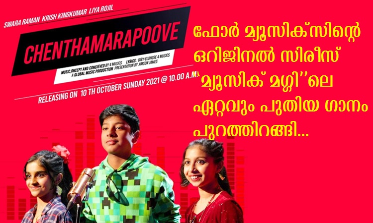 ഡബ്ലിന്‍ : ഫോര്‍ മ്യൂസിക്സിന്റെ ഒറിജിനല്‍ സിരീസ് ആയ ”മ്യൂസിക് മഗ്ഗി”ലെ ഏറ്റവും പുതിയ ഗാനം പുറത്തിറങ്ങി. ഫോര്‍ മ്യൂസിക്‌സ് ഈണമിട്ട, ഫോര്‍ മ്യൂസിക്‌സിലെ ബിബിയും ഏല്‍ദോസും രചന നിര്‍വ്വഹിച്ച ‘ചെന്താമരപൂവേ’ എന്ന പെപ്പി സോങ് പാടി ഡാന്‍സ് ചെയ്തിരിക്കുന്നത് അയര്‍ലണ്ടിലുള്ള സ്വര രാമന്‍, കൃഷ് കിങ്ങ്കുമാര്‍, ലിയ റോജില്‍ എന്നിവര്‍ ചേര്‍ന്നാണ്. മനോഹരമായ ആലാപനവും, സപ്തസ്വര ഡാന്‍സ് സ്‌കൂളിലെ കുട്ടികളുടെ ഡാന്‍സും ഒത്തു ചേര്‍ന്ന ഈ ഗാനം ചുരുങ്ങിയ സമയത്തിനുള്ളില്‍ത്തന്നെ സോഷ്യല്‍ മീഡിയയില്‍ ശ്രദ്ധ നേടിക്കഴിഞ്ഞു.