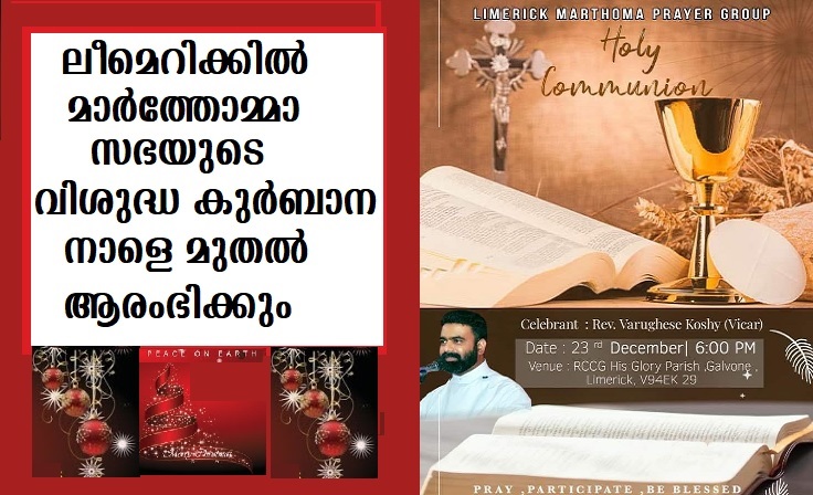 നാളെ (ഡിസംബര്‍ 23 വെള്ളിയാഴ്ച്ച ) വൈകിട്ട് ലീമെറിക്ക് ഗള്‍വോനെ ഹിസ് ഗ്ലോറി പാരീഷ് ചര്‍ച്ചില്‍ നടത്തപ്പെടുന്ന ക്രിസ്മസ് കുര്‍ബാനയ്ക്ക് ഇടവക വികാരി റവ.വര്‍ഗീസ് കോശി കാര്‍മ്മികത്വം വഹിക്കും.