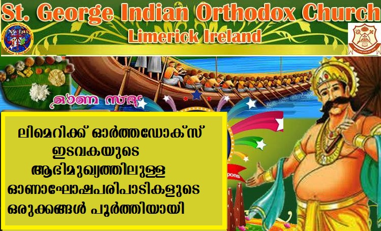 ലിമെറിക്ക് : കേരളത്തിന്റെ ദേശിയ ഉത്സവമായ ഓണക്കാലത്തിന്റെ സജീവ സ്മരണ പുതുക്കിക്കൊണ്ടു മഹാബലിയുടെ വരവും ഓണസദ്യയും കുട്ടികളുടെ ഓണക്കളികളുമായി ലിമെറിക്ക് സെന്റ് ജോര്‍ജ് ഓര്‍ത്തഡോഡോക്സ്  ഇടവകയും ഓണാഘോഷം ഒരുക്കുന്നു.