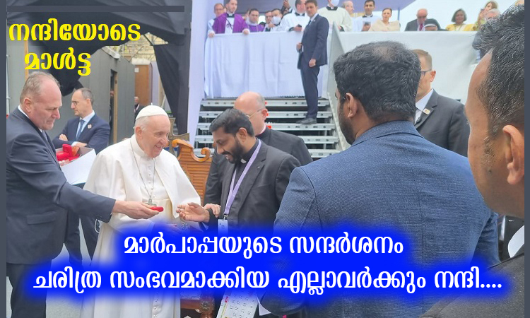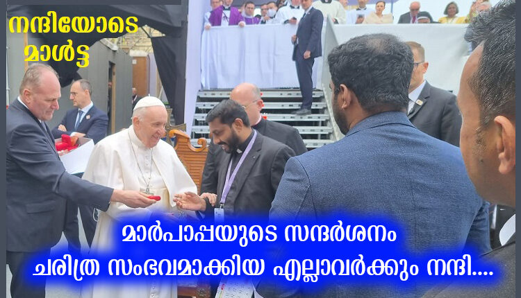 മാള്ട്ടയിലെ സീറോ മലബാര് സമൂഹവും മാര്പാപ്പയുടെ പരിപാടികളില് സജീവ ഭാഗഭാഗിത്വം വഹിച്ചു. ഇടവകാ വികാരി ഫാ. മാത്യു വാരുവേലിയുടെ നേതൃത്വത്തില് മലയാളി സമൂഹത്തിന്റെ പ്രതിനിധികള് മാര്പാപ്പയെ സന്ദര്ശിക്കാന് എത്തിയിരുന്നു. വിവിധ സ്ഥലങ്ങളിലായി നടന്ന തിരുക്കര്മ്മങ്ങളിലും മലയാളി സാന്നിദ്ധ്യം ശ്രദ്ധേയമായിരുന്നു.