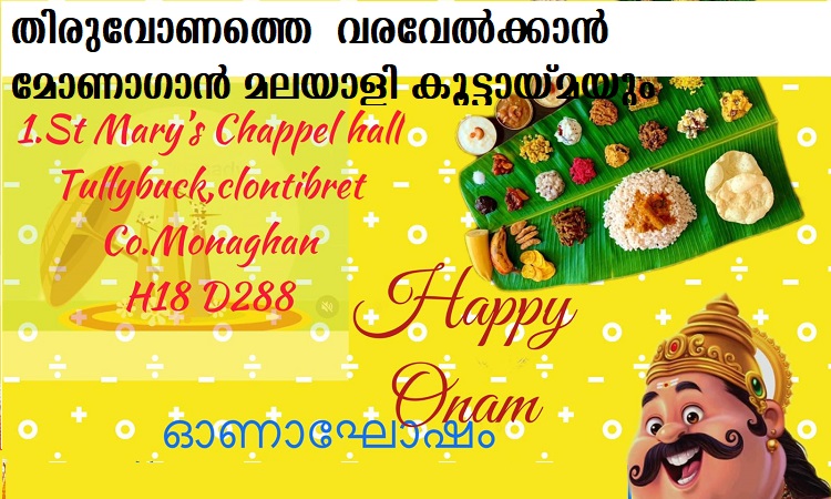 മോണാഗാന് : തിരുവോണത്തെയും ഓണത്തപ്പനെയും വരവേല്ക്കാന് മോണാഗാന് മലയാളി കൂട്ടായ്മയും ഒരുങ്ങുന്നു.ഈ മാസം 11ന് ടുള്ളിബക്ക് ക്ലോണ്ടിബ്രെറ്റിലെ സെന്റ് മേരീസ് ചാപ്പല് ഹാളിലാണ് ഓണാഘോഷം നടത്തുന്നത്.ഇതാദ്യമായാണ് വിപുലമായ രീതിയില് മോണാഗാന് മലയാളികള് ഓണാഘോഷം സംഘടിപ്പിക്കുന്നത്.