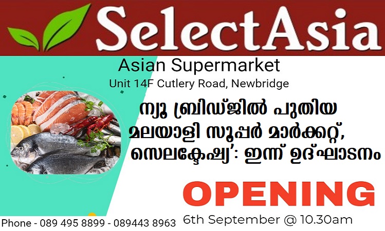 ന്യൂ ബ്രിഡ്ജ് : കൗണ്ടി കില്ഡെയറിലെ ന്യൂ ബ്രിഡ്ജില് ഇന്ന് മുതല് സെലക്ട് ഏഷ്യ എന്ന പേരില് പുതിയ ഏഷ്യന് സൂപ്പര് മാര്ക്കറ്റ് പ്രവര്ത്തനം ആരംഭിക്കും. കല്ട്ടറി റോഡില് ഇന്ന് രാവിലെ 10.30 ന് പുതിയ ഷോപ്പിന്റെ ഉദ്ഘാടനം നടത്തപ്പെടുമെന്ന് സെലക്റ്റേഷ്യാ മാനേജ്മെന്റ് അറിയിച്ചു.