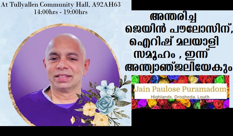 ഡബ്ലിന് : അയര്ലണ്ടിലെ ദ്രോഗഡയില് കഴിഞ്ഞ തിങ്കളാഴ്ച അന്തരിച്ച ആലുവാ സ്വദേശിയും, ഇന്ത്യന് ഫാമിലി അസോസിയേഷന് പ്രസിഡണ്ടുമായിരുന്ന ജെയ്ന് പൗലോസ് പുറമഠത്തിന് ഐറിഷ് സമൂഹം ഇന്ന് അന്ത്യാഞ്ജലിയേകും.