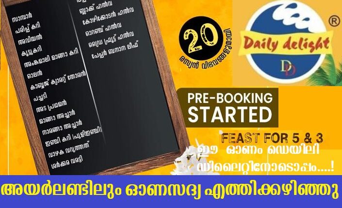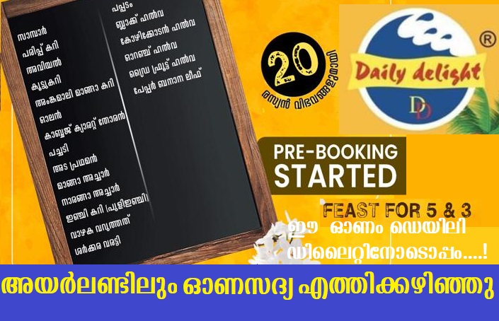 വ്യത്യസ്തമായ രുചി കൂട്ടുകളിലൂടെ നിങ്ങളെ വിസ്മയിപ്പിക്കുന്ന ഡെയിലി ഡിലൈറ് ഈ വര്‍ഷത്തെ ഓണ സദ്യയുടെ പ്രീ ബുക്കിംഗ് സെയില്‍ അയര്‍ലണ്ടിലെ വിവിധ ഏഷ്യന്‍ /ഇന്ത്യന്‍ ഷോപ്പുകളിലൂടെ ആരംഭിച്ചിരിക്കുകയാണ് .