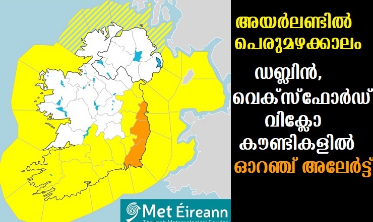 ഡബ്ലിന് : അയര്ലണ്ടില് പെരുമഴ പെയ്യുന്ന ദിവസങ്ങളായിരിക്കും വാരാന്ത്യത്തിലെന്ന് തുടർച്ചയായ മുന്നറിയിപ്പ് നൽകി കാലാവസ്ഥാ കേന്ദ്രം.രാജ്യത്തെ ഡബ്ലിന്, വെക്സ്ഫോര്ഡ്, വിക്ലോ കൗണ്ടികളില് ഇന്ന് മെറ്റ് ഏറാന് ഓറഞ്ച് അലേര്ട്ട് പ്രഖ്യാപിച്ചു.