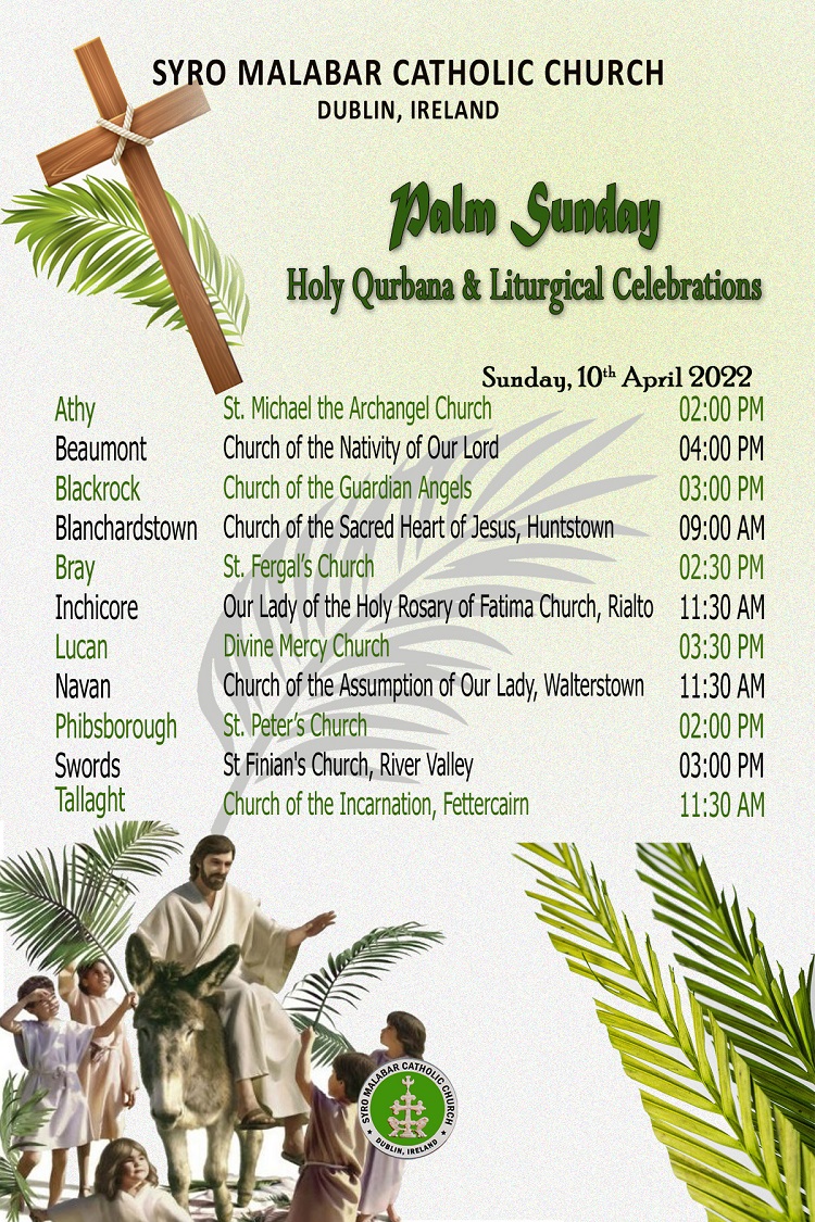 2022 ഏപ്രില് 10 ഞായറാഴ്ച ഓശാന തിരുകര്മ്മങ്ങള് അയര്ലണ്ടിലെ എല്ലാ കുര്ബാന സെന്ററുകളിലും നടത്തപ്പെടും. വിശുദ്ധ കുര്ബനയും, കുരുത്തോല വെഞ്ചരിപ്പും പ്രദക്ഷിണവും ഉണ്ടായിരിക്കും.