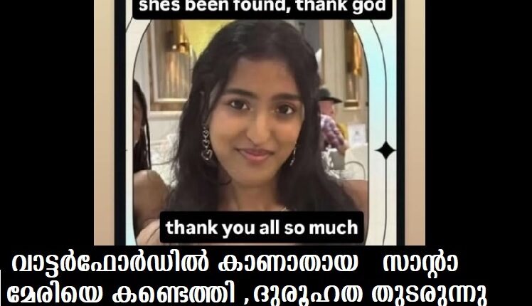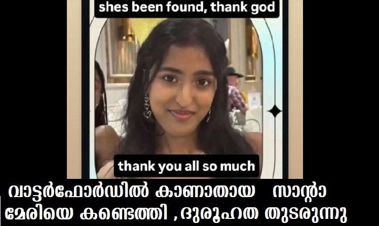 സംഭവം പുറത്തറിഞ്ഞത് മുതല് വാട്ടര്ഫോര്ഡ് മലയാളി കമ്യുണിറ്റി ഒന്നടക്കം സാന്റാ മേരിയ്ക്കായി നടത്തിയത് സമാനതകളില്ലാത്ത ഒത്തൊരുമയോടെയായിരുന്നു. പൊതുസമൂഹവും,സോഷ്യല് മീഡിയയും ഒന്ന് ചേര്ന്ന് നടത്തിയ അക്ഷീണ പരിശ്രമത്തിന് ഇന്നലെ വൈകുന്നേരത്തോടെ ഫലം കണ്ടെങ്കിലും , സംഭവത്തിന് പിന്നിലെ ദുരുഹതകളെ കുറിച്ച് വാട്ടര്ഫോര്ഡിലെ മലയാളി സമൂഹം പരിഭ്രാന്തിയിലാണ്.