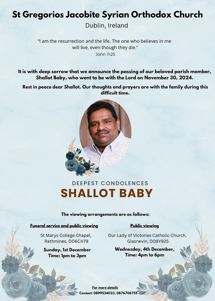 ഡബ്ലിന്‍ : ഡബ്ലിനിലെ ആദ്യകാല കുടിയേറ്റക്കാരില്‍ ഒരാളും,  ഫിംഗ്ലസ് ഹാംപ്ടണ്‍ വുഡിലെ താമസക്കാരനും  കാറ്ററിംഗ് മേഖലയിലെ സജീവ സാന്നിധ്യവുമായിരുന്ന ഷാലറ്റ് ബേബി (51) അന്തരിച്ചു.