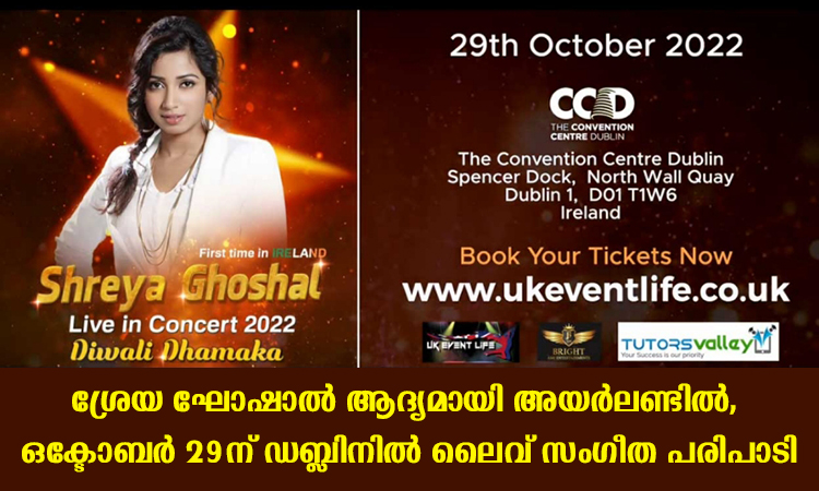ഇതാദ്യമായാണ് ശ്രേയ ഘോഷാല് അയര്ലണ്ടില് എത്തുന്നത്. ഡബ്ലിന് കണ്വന്ഷന് സെന്ററിലാണ് ‘ദീവാലി ദമാക്ക’ എന്നു പേരിട്ടിരിക്കുന്ന പരിപാടി അരങ്ങേറുക.
