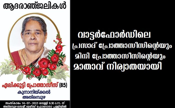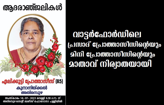 വാട്ടര്‍ഫോര്‍ഡ് : വാട്ടര്‍ഫോര്‍ഡ് നിവാസി പ്രസാദ് പ്രോത്താസീസിന്റെയും മിനി പ്രോത്താസീസിന്റെയും മാതാവ് കൂനാനിക്കല്‍ ഏലിക്കുട്ടി പ്രോത്താസീസ് (85) അതിരമ്പുഴയില്‍ നിര്യാതയായി.