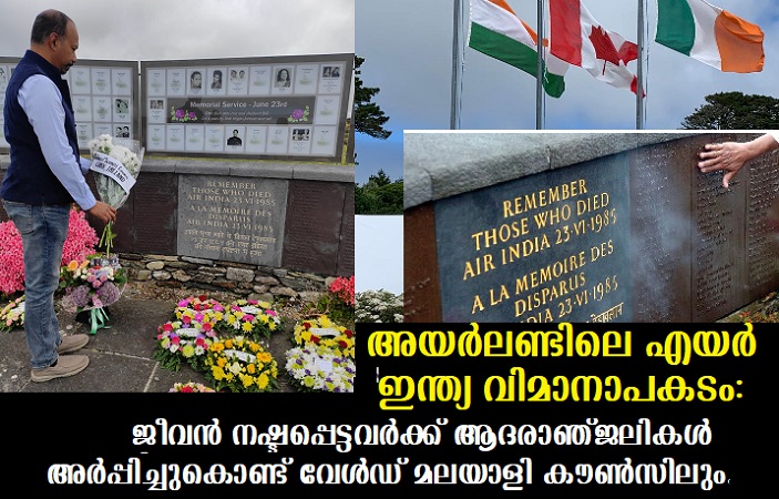 കോര്‍ക്ക്: അയര്‍ലണ്ടിലെ എയര്‍ ഇന്ത്യ വിമാനാപകടത്തില്‍ ജീവന്‍ നഷ്ടപ്പെട്ടവര്‍ക്ക് ആദരാഞ്ജലികള്‍ അര്‍പ്പിച്ചുകൊണ്ട് വേള്‍ഡ് മലയാളി കൗണ്‍സിലും. 1985 ജൂണ്‍ മാസം 23ന് കാനഡയില്‍ നിന്നും ലണ്ടന്‍ വഴി ഡല്‍ഹിയിലേക്ക് പറക്കുകയായിരുന്ന എയര്‍ ഇന്ത്യ കനിഷ്‌ക വിമാനം അയര്‍ലണ്ടിനോടടുത്ത് അറ്റ്‌ലാന്റിക് സമുദ്രത്തില്‍, സിഖ് ഭീകരരുടെ ബോംബാക്രമണത്തില്‍ തകര്‍ന്ന് വീഴുകയായിരുന്നു.