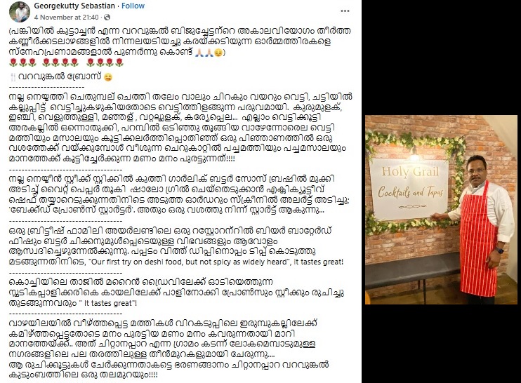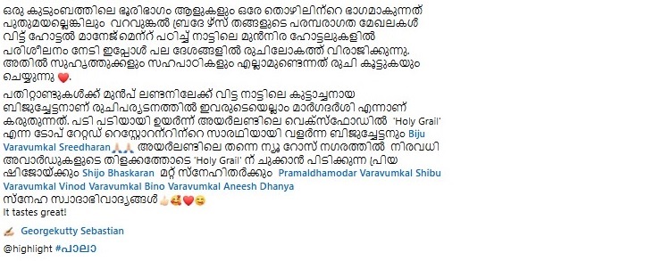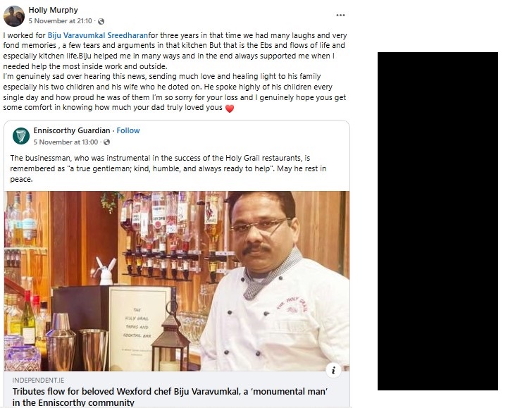 ഇരുപത് വര്ഷം മുമ്പ് അയര്ലണ്ടില് എത്തിയ ബിജു , വെക്സ് ഫോര്ഡ് മേഖലയില് ഇന്ത്യന് രുചിയുടെ ബ്രാന്ഡ് അംബാസിഡറായും , അദ്ദേഹം ആരംഭിച്ച ഹോളി ഗ്രെലിനെ ഇന്ത്യന് ഫുഡിന്റെ അപരനാമമായും അറിയപ്പെടാന് കാരണമായി. നൂറുകണക്കിന് ഇന്ത്യക്കാര്ക്ക് തൊഴില് നല്കാനും ,അവര്ക്ക് പിന്തുണയും കരുതലും നല്കാനും അദ്ദേഹത്തിന് കഴിഞ്ഞു.അയർലണ്ടിലെ മുഖ്യധാരാ മാധ്യമങ്ങൾ പോലും ബിജുവിന്റെ നിര്യാണവാർത്ത റിപ്പോർട്ട് ചെയ്തത് അദ്ദേഹത്തിന്റെ നിസ്തുല സേവനത്തിന്റെ മഹനീയതയെ അനുസ്മരിച്ചുകൊണ്ടാണെന്നതും ശ്രദ്ധേയമായി