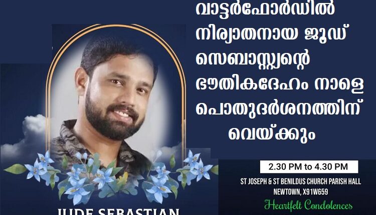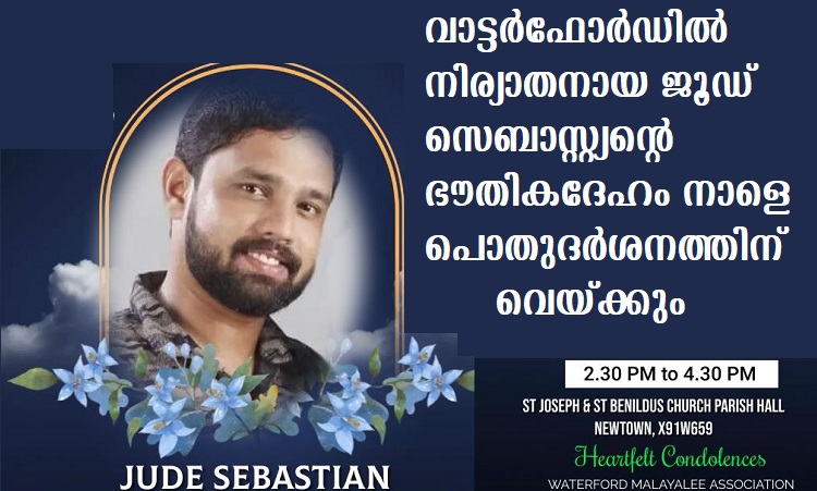 വാട്ടര്ഫോര്ഡില് നിര്യാതനായ ജൂഡ് സെബാസ്റ്റ്യന്റെ ഭൗതികദേഹം നാളെ (ശനിയാഴ്ച ) പൊതുദര്ശനത്തിന് വെയ്ക്കും