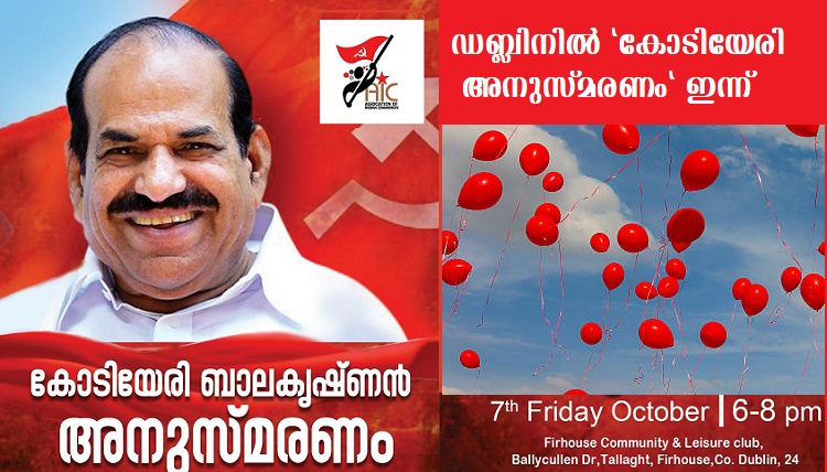 ഡബ്ലിന്‍: അസോസിയേഷന്‍ ഓഫ് ഇന്ത്യന്‍ കമ്മ്യൂണിസ്റ്റിന്റെ (AIC) നേതൃത്വത്തില്‍ സിപിഐ എമ്മിന്റെ സമുന്നത നേതാവും മുന്‍ സംസ്ഥാന സെക്രട്ടറിയുമായ കോടിയേരി ബാലകൃഷ്ണന്റെ അനുസ്മരണം ഇന്ന് ഡബ്ലിനില്‍ സംഘടിപ്പിക്കുന്നു.