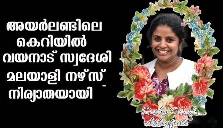ട്രേലി : അയര്ലണ്ടിലെ കൗണ്ടി ലീമെറിക്കിലെ ആബിഫീലെയിൽ താമസിക്കുന്ന മലയാളി യുവതി പ്രസവത്തെ തുടര്ന്ന് മരണപ്പെട്ടു.വയനാട് സുല്ത്താന് ബത്തേരി സ്വദേശി ബൈജു സ്കറിയയുടെ ഭാര്യയും കെറി യൂണിവേഴ്സിറ്റി ഹോസ്പിറ്റലിലെ സ്റ്റാഫ് നഴ്സുമായിരുന്ന സ്റ്റെഫി ഔസേഫാണ് ഇന്നലെ വൈകുന്നേരം നിര്യാതയായത്.