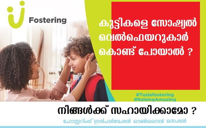 നിങ്ങള്ക്ക് താത്പര്യമുണ്ടെങ്കില് നാളെ (ജൂണ് 30 ,വ്യാഴാഴ്ച) TUSLA സംഘടിപ്പിക്കുന്ന ഓണ്ലൈന് ഫോസ്റ്ററിംഗ് ഇന്ഫര്മേഷന് സെഷനില് നിങ്ങള്ക്ക് പങ്കുചേരാം. വ്യാഴാഴ്ച്ച വൈകിട്ട് 7 മുതല് 8.30 വരെയാണ് ഇന്ഫോര്മേഷന് സെഷന് നടത്തപ്പെടുക.