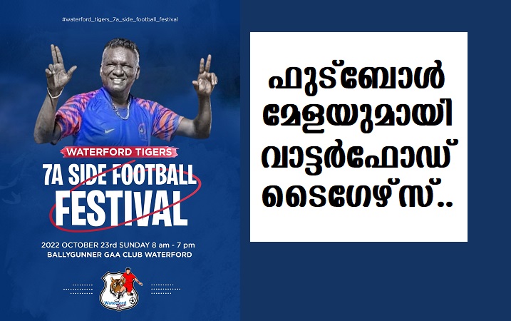 ഒക്ടോബര് 23 ഞായറാഴ്ചയാണ് ബാലിഗണ്ണര് ഇന്ഡോര് സ്റ്റേഡിയത്തില് 7 A സൈഡ് ഫുട്ബോള് മേള നടത്താന് വാട്ടര്ഫോഡ് ടൈഗേഴ്സ് ഒരുങ്ങുന്നത്.രണ്ടു വിഭാഗങ്ങളിലായി നടക്കുന്ന ഫുട്ബോള് മേളയില് അയര്ലണ്ടിന്റെ വിവിധ ഭാഗങ്ങളില് നിന്നുള്ള പ്രമുഖ ടീമുകള് പങ്കെടുക്കും.