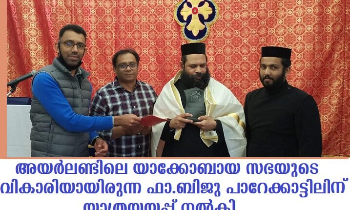 2011 മുതല് പത്തുവര്ഷക്കാലം അയര്ലന്ഡില് സേവനമനുഷ്ഠിച്ച ഫാദര് ബിജു എം പാറേക്കാട്ടില് ഏപ്രില് 28നാണ് നാട്ടിലേക്ക് മടങ്ങുന്നത്. ഇടുക്കി പണിക്കന്കൂടി സ്വദേശിയായ ഫാദര് ബിജു യാക്കോബായ സഭയുടെ അങ്കമാലി ഭദ്രാസനത്തിലെ ഹൈറേഞ്ച് മേഖല വൈദികനും അറിയപ്പെടുന്ന സഭാ പണ്ഡിതനും ആണ്.